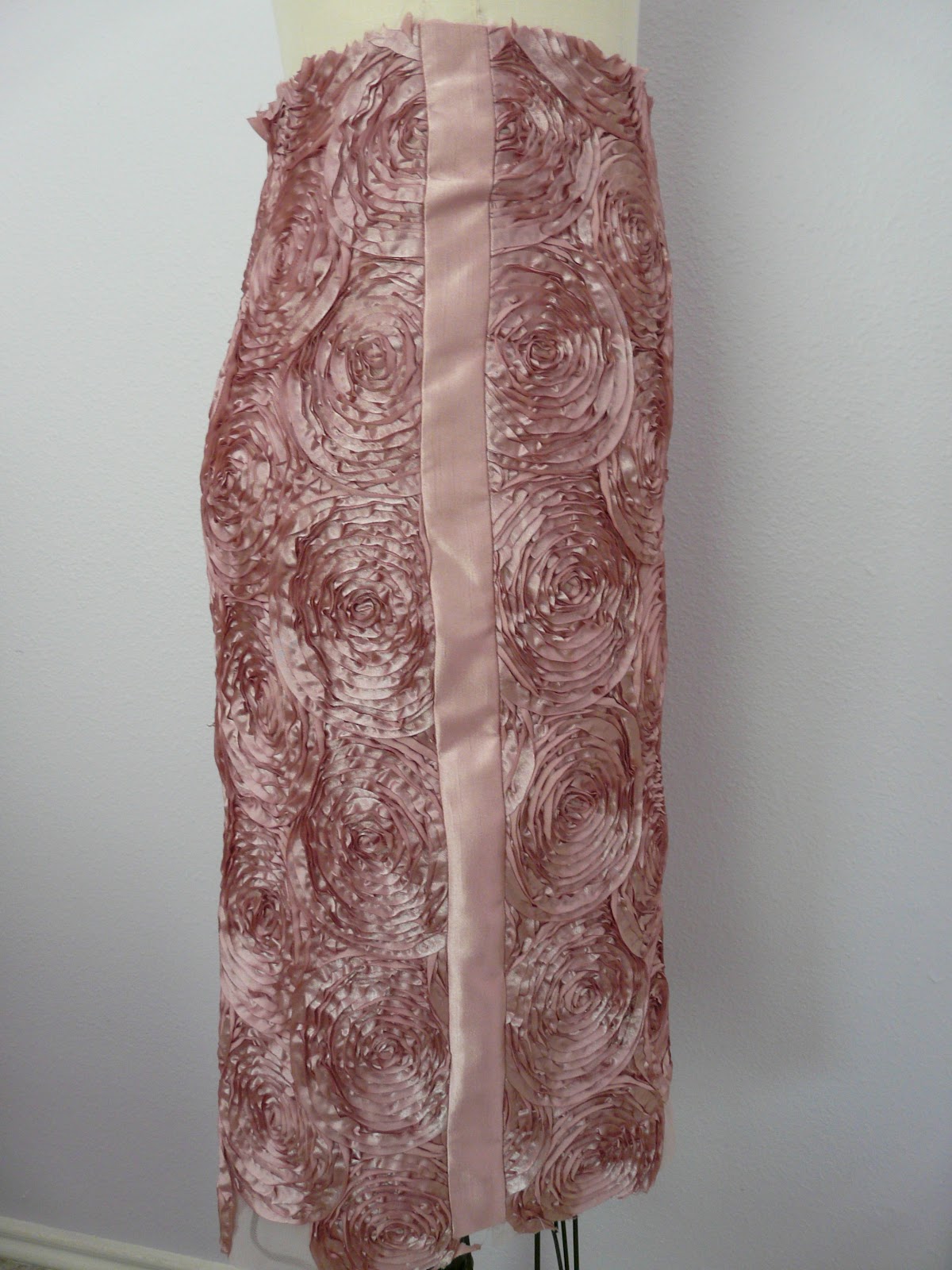 Ugh! Messy side seams! The backs matched perfectly, BTW, I just didn't have enough fabric to make the sides match up. And honestly, I wasn't even thinking about it. Yes, I realize nobody would have noticed but me. I tried to forget about that awful twinning. I let the skirt rest for a day to think about it, but I just couldn't leave it that way. Brainstorm! Why not add silky panels down the side seams in a matching rosy pink like tuxedo pants have: